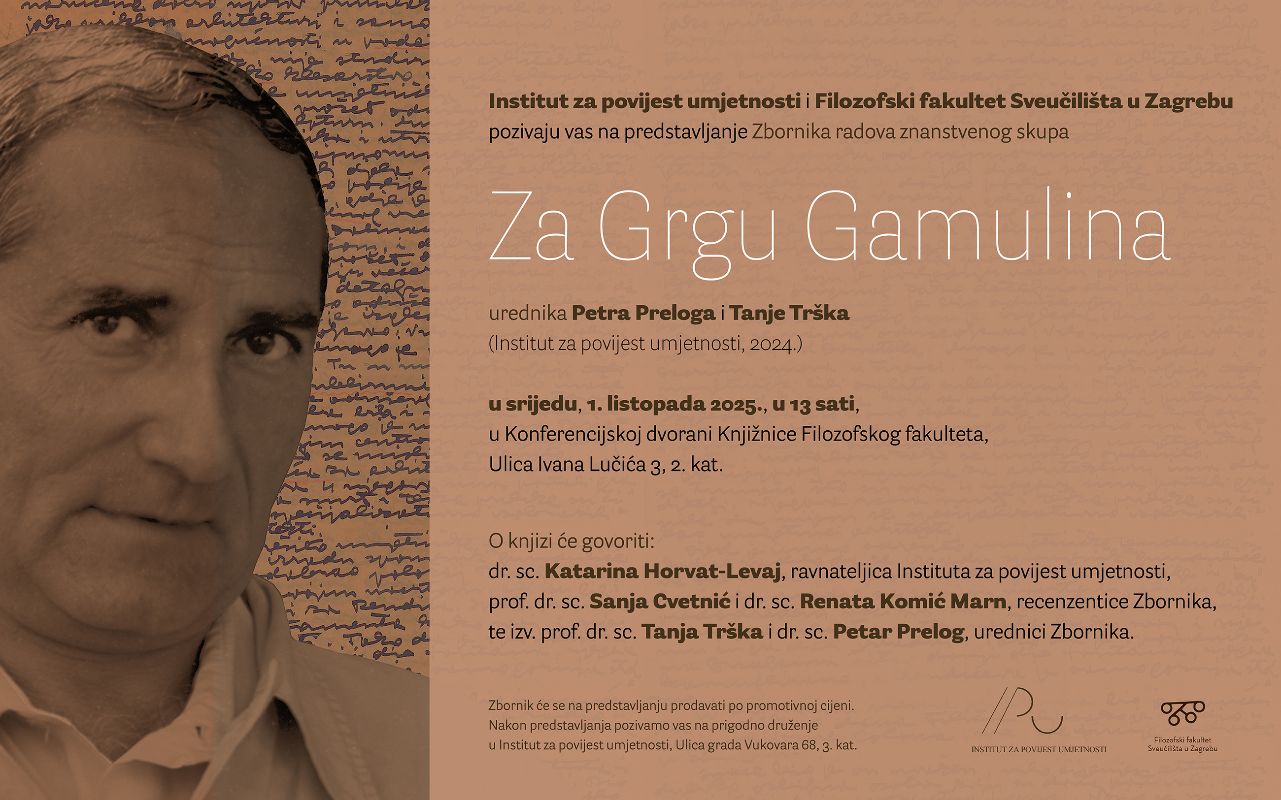 Institut za povijest umjetnosti i Filozofski fakultet Sveučilišta u Zagrebu pozivaju vas na predstavljanje Zbornika radova znanstvenog skupa Za Grgu Gamulina (Institut za povijest umjetnosti, 2024.) urednika Petra Preloga i Tanje Trška u srijedu, 1. listopada 2025., u 13:00 sati, u Konferencijskoj dvorani Knjižnice Filozofskog fakulteta (Ulica Ivana Lučića 3, 2. kat).