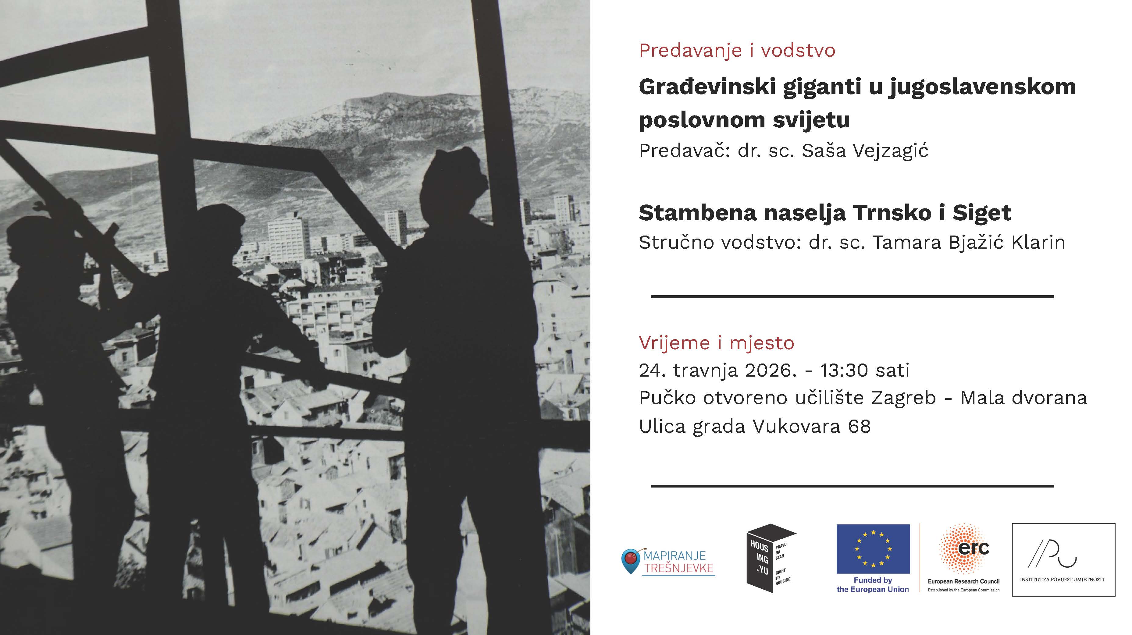 Javno predavanje dr. sc. Saše Vejzagića „Građevinski giganti u jugoslavenskom poslovnom svijetu“ održat će se u sklopu programa Tura kultura koji se provodi u organizaciji projekta Mapiranje Trešnjevke u petak, 24. travnja 2026., u 13:30 u Maloj dvorani Pučkog otvorenog učilišta u Zagrebu (Ulica grada Vukovara 68, prizemlje). Nakon predavanja dr. sc. Tamara Bjažić Klarin, voditeljica projekta Housing.YU, održat će stručno vodstvo kroz novozagrebačka stambena naselja Trnsko i Siget. Početak vodstva je u blizini autobusne stanice Savski Gaj u 15:40 sati.