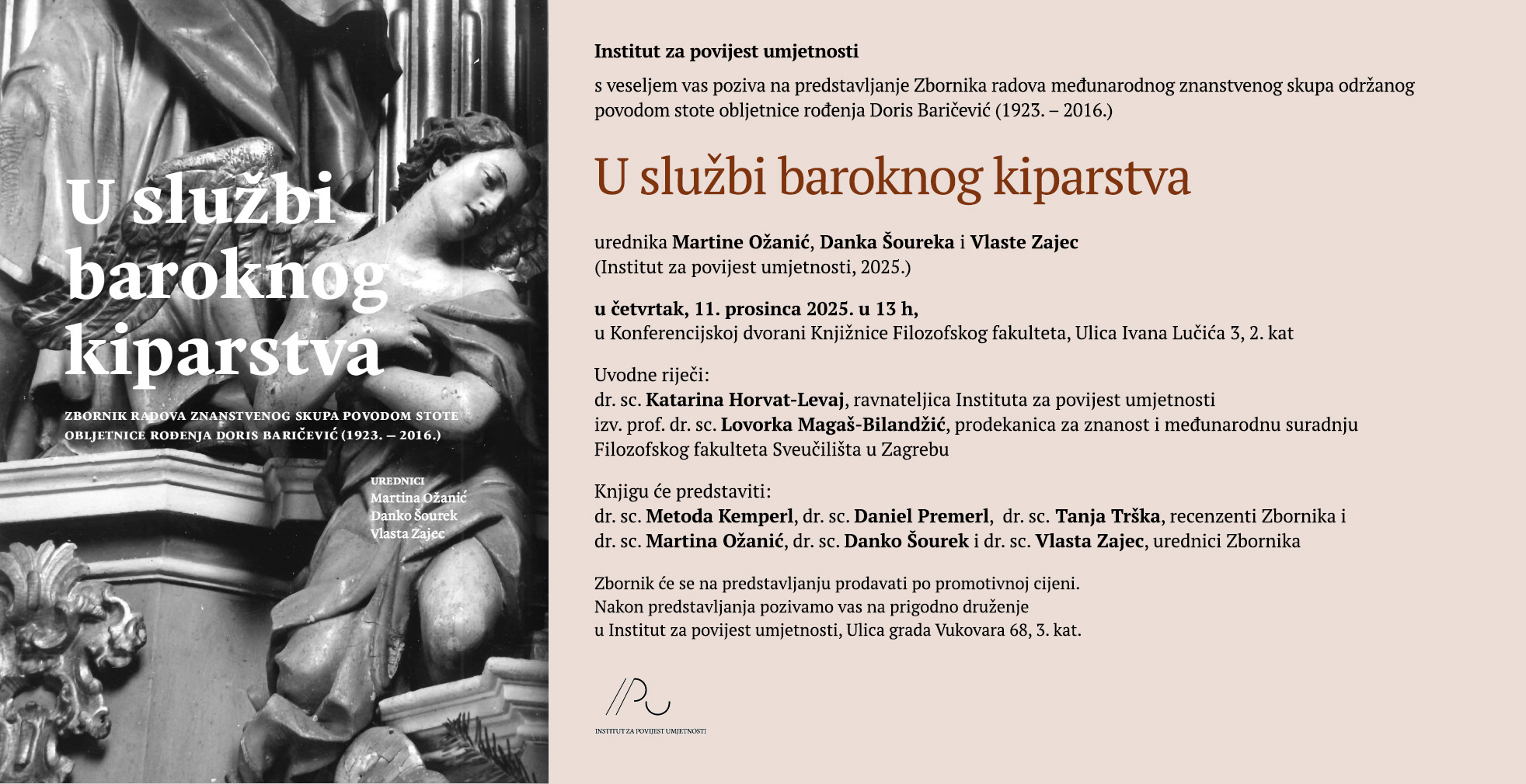 Predstavljanje zbornika U službi baroknog kiparstva održat će se u četvrtak, 11. prosinca 2025. u 13:00 sati na Filozofskom fakultetu u Zagrebu.